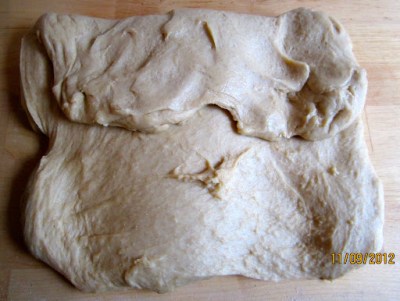 Teig auf einer leicht eingeölten Arbeitsfläche mit eingeölten Händen sanft zu einem Quadrat auseinander ziehen, und dann von oben nach unten wie einen Geschäftsbrief in drei Teile falten. Das gleiche dann von beiden kurzen Seiten wiederholen.