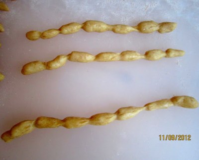 Rest in 6 gleiche Teile schneiden. Zu Strängen rollen (etwas länger als der Durchmesser der Brote.) In der Mitte beginnend, Stränge mit Daumen und Zeigefinger im Abstand von 2.5 cm fest zusammendrücken oder drehen, um „Gebeine“ zu formen. (Die Stränge müssen an diesen Stellen wirklich dünn sein, damit die Form beim Backen erhalten bleibt).