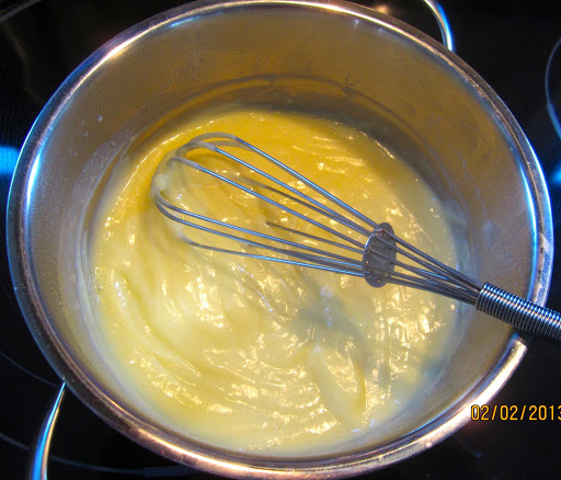 | Ständig mit dem Schneebesen schlagen, bis die Masse eindickt |