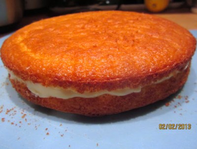 Mit langem Sägemesser Kuchen waagrecht in zwei Teile schneiden. Unteren Boden gleichmässig bis zum Rand mit Vanillecreme bestreichen. Oberen Boden darauflegen.