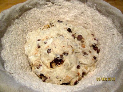Mehle, Salz, Trockenhefe und Wasser in einer grossen Schüssel mischen. Getrocknete Kirschen, Schokolade und Nüsse unterrühren, bis ein sehr weichen Teig entsteht. Zugedeckt bei Zimmertemperatur über Nacht stehen lassen (mindestens 12 Stunden).