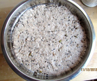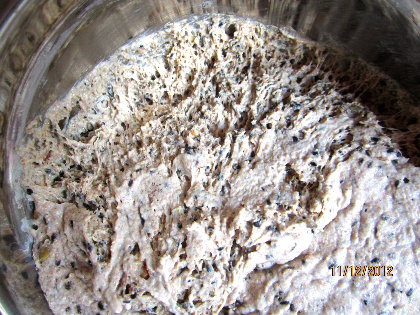Alle trockenen Teigzutaten in einer grossen Schüssel verrühren. Eingeweichte Getreidekörner darüber streuen und fast alles Wasser dazugeben. Mit einem grossen Holzlöffel mischen, bis alles Mehl angefeuchtet ist. (Der Teig soll weich und klebrig sein, falls nicht, etwas mehr Wasser dazugeben). Mit Plastikfolie abdecken und bei Zimmertemperatur 12 – 18 Stunden reifen lassen.