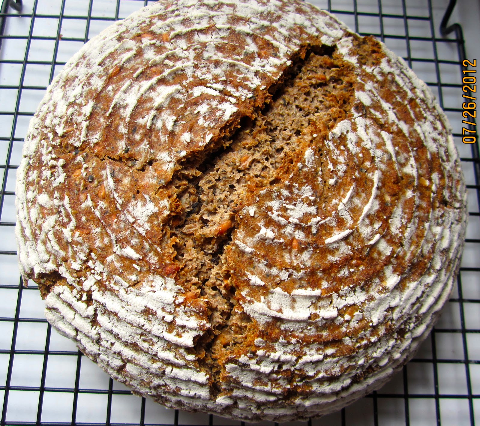 Oh weh! HomeGoods, meine Quelle für herabgesetzte Küchenartikel, liess mich gerade jetzt schnöde im Stich, wo ich es dringend gebraucht hätte! Immernoch ohne Topf in der richtigen Grösse, kam ich auf die Idee, es mit einer freigeschobenen Sauerteigversion zu versuchen, mit Vorteigen à la Peter Reinharts Whole Grain Breads.
