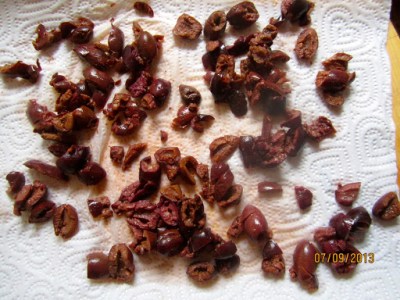Oliven im Sieb abtropfen lassen, grob hacken und auf einer dicke Lage Küchenkrepp mehrere Stunden trocknen lassen (sie werden immer noch feucht sein).