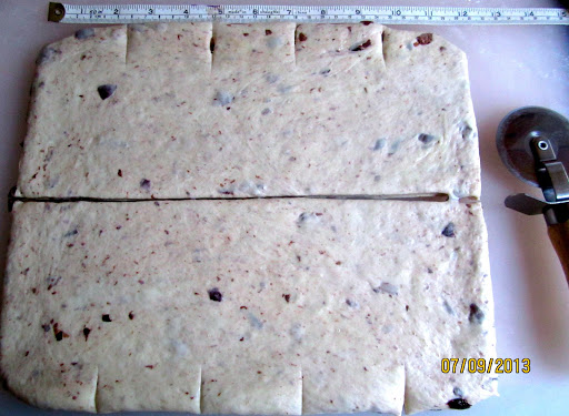 Teig auf einer leicht bemehlten Arbeitsfläche mit Hilfe der Schablone zu einer 24 x 30 cm grossen, etwa 1.5 cm dicken Platte ausrollen. Kanten begradigen. Teigplatte erst mit einem Pizzaschneider oder Messer längs halbieren, dann jede Hälte in 5 gleich grosse Teile schneiden. (Teig ist sehr weich).