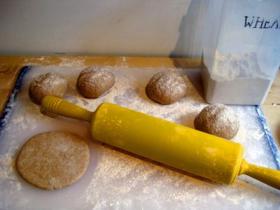 Ich fing an, sie auszurollen. Der Teig reagierte jetzt so elastisch wie frischer, aber die Oberfläche der Pitas war dunkler und sah etwas scheckig aus.