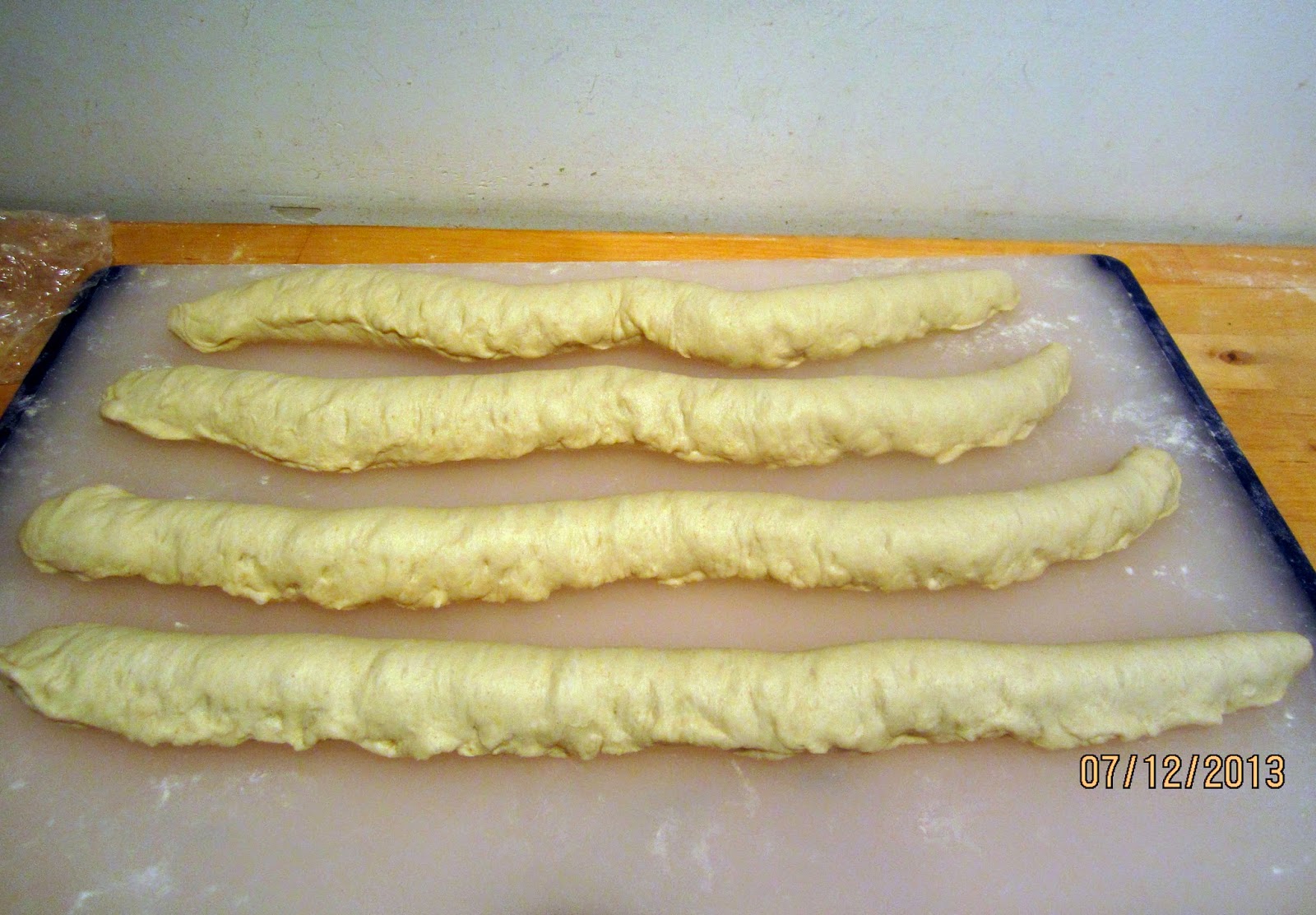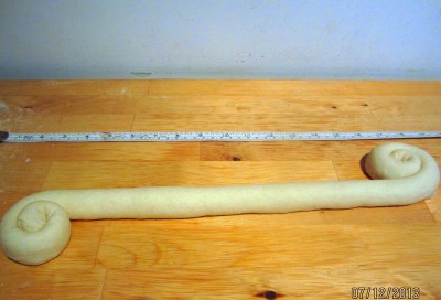 Schliesslich jedes Baguette von beiden Enden her zu einem S aufrollen (dabei aufpassen, dass die Naht sich darunter befindet!)