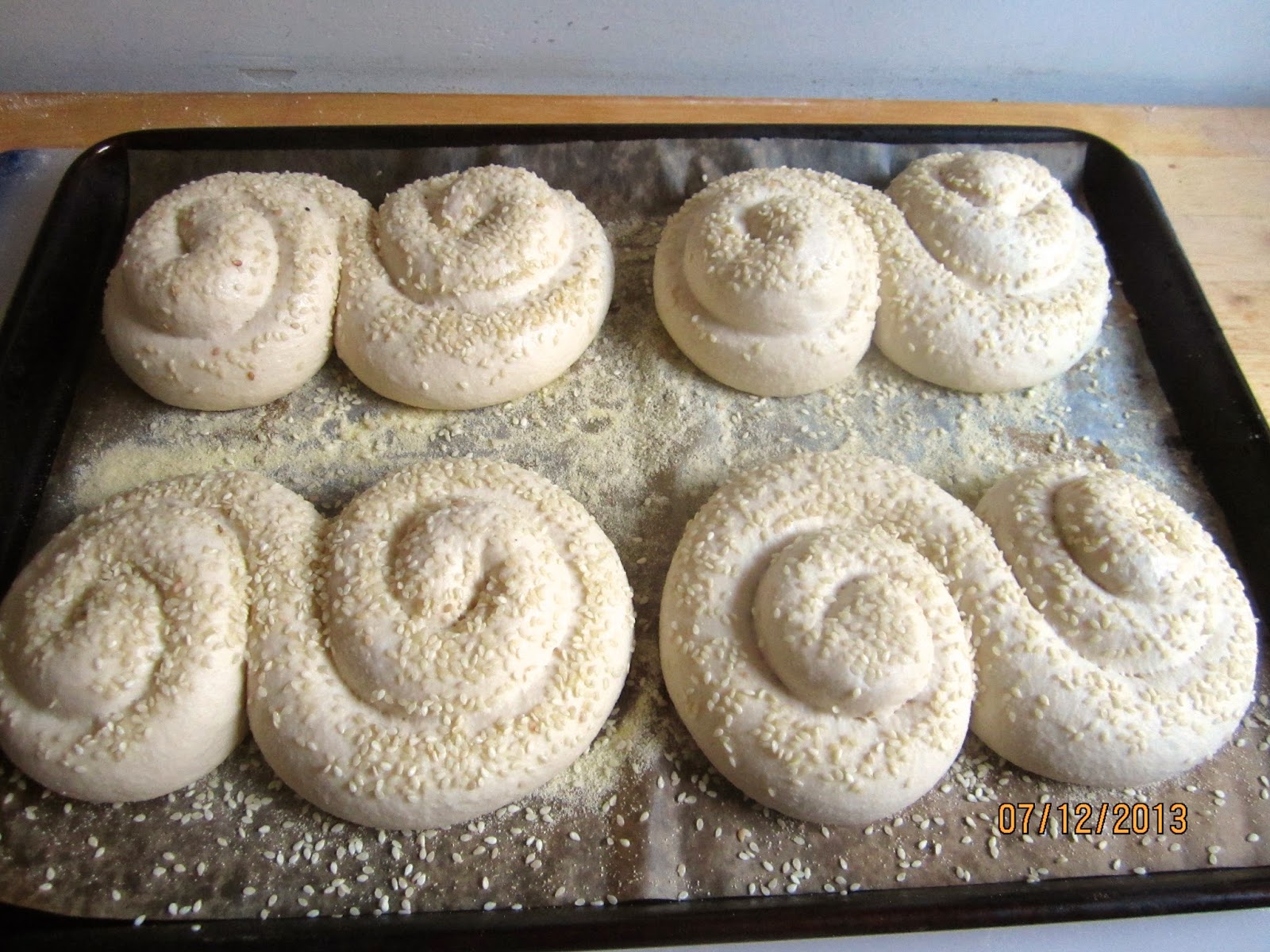 Brote aufs vorbereitete Backblech legen, mit Wasser besprühen und Sesamsaat bestreuen, dabei die Samen leicht andrücken. Mit Backspray einsprühen (damit sie nicht abtrocknen).