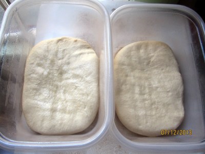 Teig in eingefettete Container legen, einmal herumdrehen, damit er eingeölt ist, und zugedeckt bei Zimmertemperatur etwa 2 Stunden, oder so lange reifen lassen, bis er sich verdoppelt hat. (Ich teile ihn gern schon vorher in zwei Portionen, dann muss ich hinterher weniger damit herumhantieren).