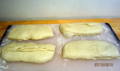 Teig in 4 gleichgrosse Stücke teilen und erst zu Bâtards, dann zu Baguettes formen. An beiden Enden fassen, hochheben und auf etwa 61 cm Länge dehnen (das geht normalerweise beinahe von selbst).