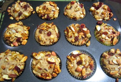 Etwa 2/3 der Apfelmischung unter den Muffinteig heben. Teig auf die Papierförmchen verteilen (ca. 3/4 voll). Mit der restlichen Frucht-Mandelmischung bestreuen, sie dabei leicht andrücken.