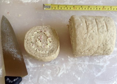 Teig zu einem 20 x 45-50 cm grossen Rechteck (1.25 cm dick) ausrollen, die kurze Seite vorn.