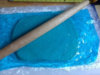 Kante dieser kurzen Seite mit der Teigrolle abflachen (damit man sich hinterher keine dicke Naht bekommt).