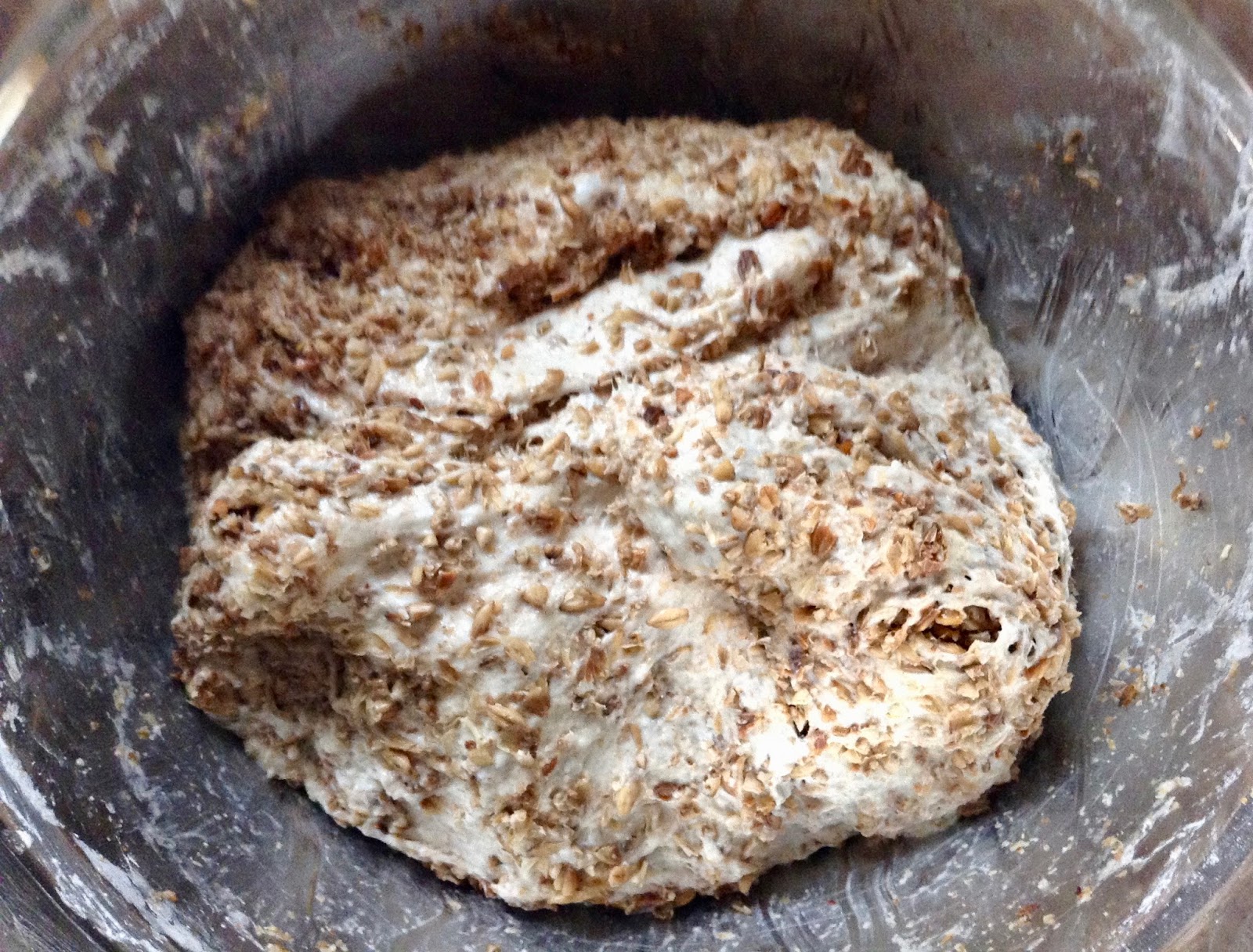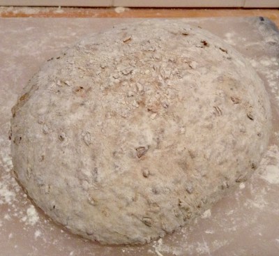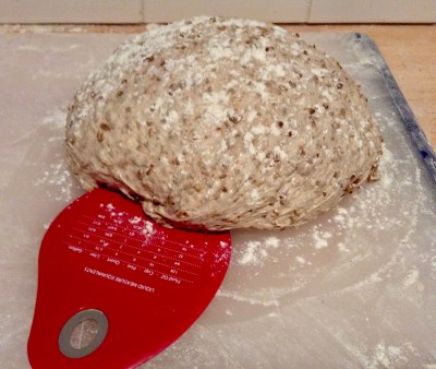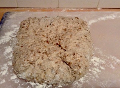 Überschüssiges Mehl und Flocken vom Papier bürsten (damit du nachher nicht eine Menge verbranntes Mehl im Topf findest). Brot nach Wunsch einschneiden.