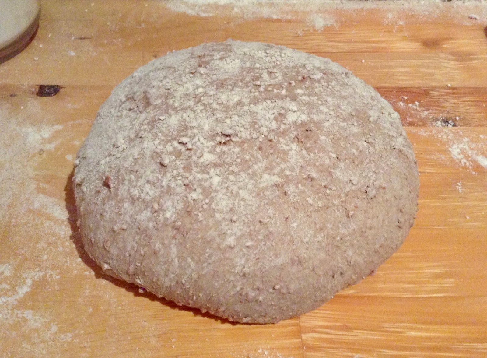 Arbeitsfläche zur Hälfte mit Mehl bestäuben, die andere Hälfte freilassen. Teig auf den bemehlten Bereich legen und leicht mit Mehl bestreuen.  Zu einem straffen Rund vorformen. Dazu mit einem eingefetteten Teigschaber (oder Teigabstecher) kreisförmig schräg unter den Teigrand herumfahren, um dadurch Oberflächenspannung zu erzeugen.