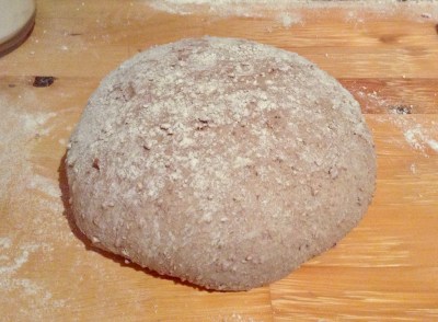 Oberfläche des Teiglings wieder mit Mehl bestreuen, mit der umgestülpten Schüssel zudecken und  20 – 30 Minuten lang ruhen lassen.