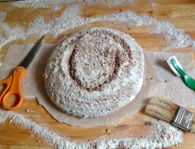 Brot mit energischem Klaps des Gärkörbchen auf die papierbelegte Arbeitsfläche auskippen. Papier um den Laib herum zurechtschneiden, dabei zwei breite Streifen als Handgriffe stehen lassen (siehe Foto – dadurch kann das überstehendes Papier keine Falten werfen, die sich in den Teig eindrücken).