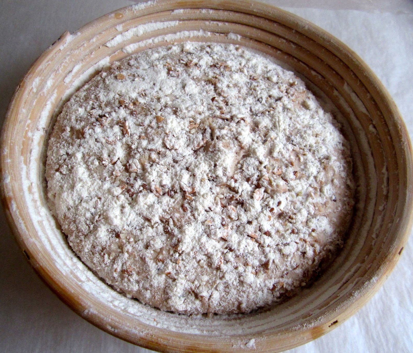 Gärkörbchen grosszügig mit Mehl ausstreuen (eine 50/50-Mischung aus Weizen- und Reismehl verhindert Ankleben besonders gut). Boden dicht mit Getreideflocken (oder anderem Topping) bestreuen (sieht nicht nur attraktiv aus, sondern verhindert ebenfalls das Klebenbleiben).