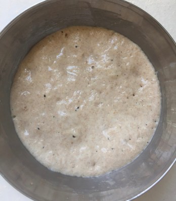 Morgens: Alle Starterzutaten gut vermischen. Zugedeckt 6 – 8 Stunden bei Zimmertemperatur stehen lassen, bis er aufgepufft aussieht und sich Blasen an der Oberfläche zeigen.