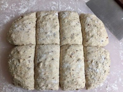 Teig auf eine leicht bemehlte Arbeitsfläche geben. Mit etwas Mehl bestäuben (er wird immer noch kleben), und sanft zu einem Rechteck drücken und ziehen. In 8 rechteckige Stücke schneiden. Teiglinge auf ein mit Backpapier belegtes (oder eingefettetes, perforiertes) Blech legen.