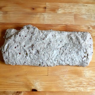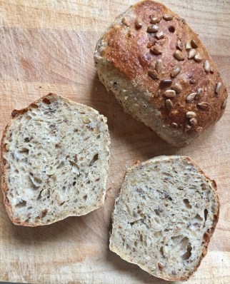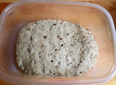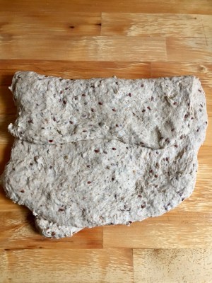 Meine Änderungen: ich habe den Sauerteiganteil ein bisschen erhöht, nicht nur Sonnenblumenkerne, sondern auch die Altbrotkrümel geröstet, und die Methode auf – mein bevorzugtes – Strecken und Falten (à la Peter Reinhart) mit Übernachtgare umgestellt. Daher konnte ich auch die Hefemenge im Hauptteig etwas verringern (mangels Frischhefe verwende ich hier in Maine grundsätzlich Trockenhefe).
