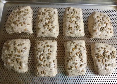 Brötchen mit Eiweiss bestreichen, dann mit Sonnenblumenkernen bestreuen (sanft andrücken). Zugedeckt 25 – 30 Minuten lang gehen lassen, bis eine mit dem Finger eingedrückte Delle sichtbar bleibt. (Da der Teig nicht geformt, sondern nur geschnitten wird, wird er nicht entgast und braucht nicht mehr lange aufgehen – im Prinzip nur bis der Ofen aufgeheizt ist).