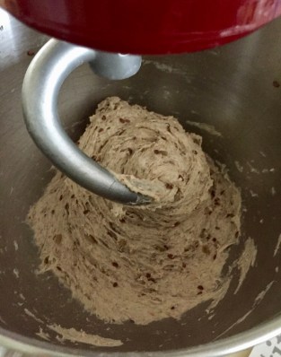 Nachmittags: Zutaten für den Hauptteig auf niedriger Stufe mischen, bis alles Mehl durchfeuchtet ist. 5 Minuten ruhen lassen, dann auf mittel-langsamer Stufe 6 Minuten lang kneten. Der Teig wird weich und klebrig sein, aber die Schüsselwände freigeben.