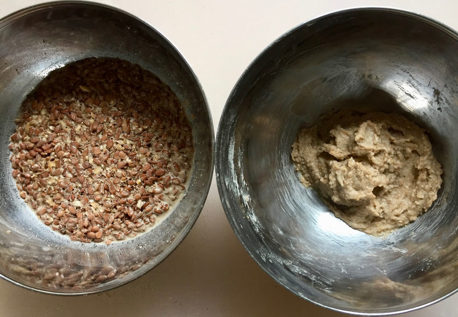 In einer zweiten kleinen Schüssel Quellstück mischen. (Dieser zusätzliche Schritt ist nicht unbedingt nötig, aber harten Zutaten wie grobem Roggenschrot und Leinsamen tut längeres Einweichen gut.)