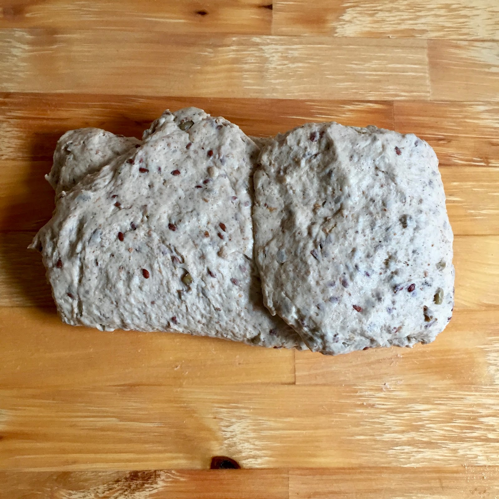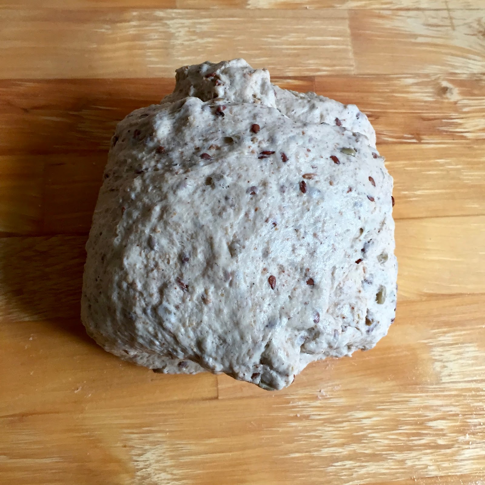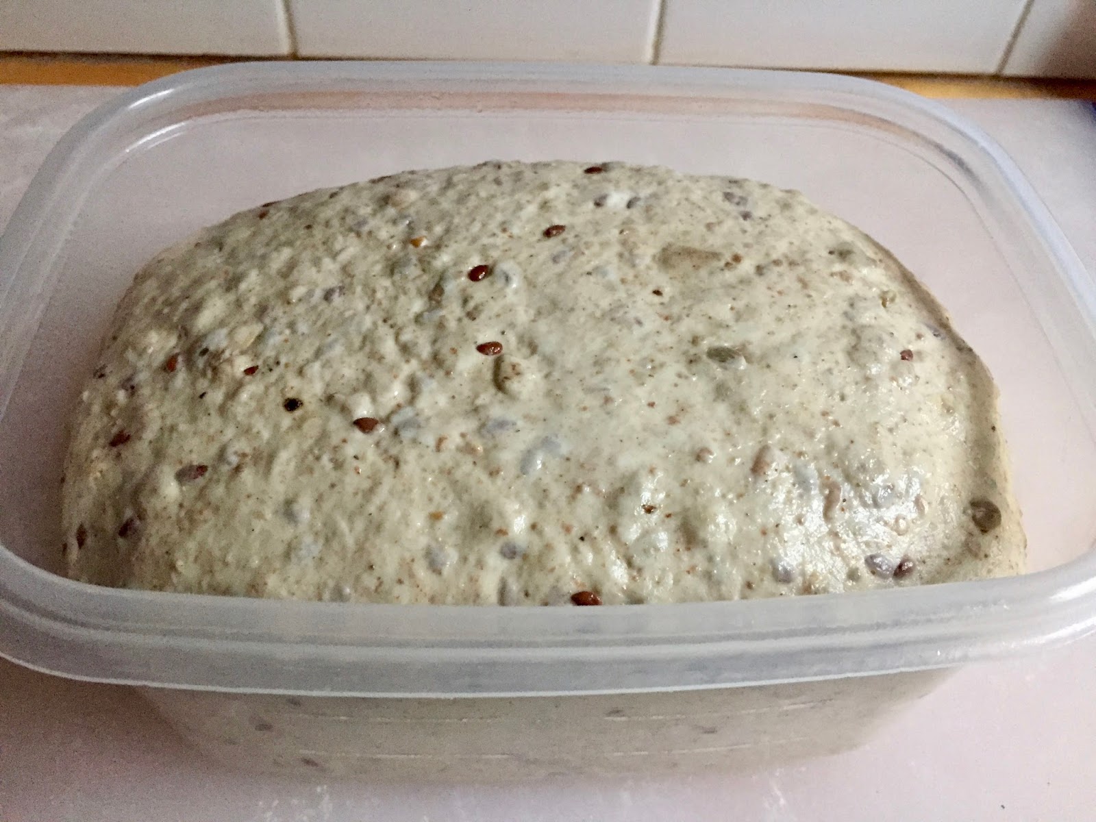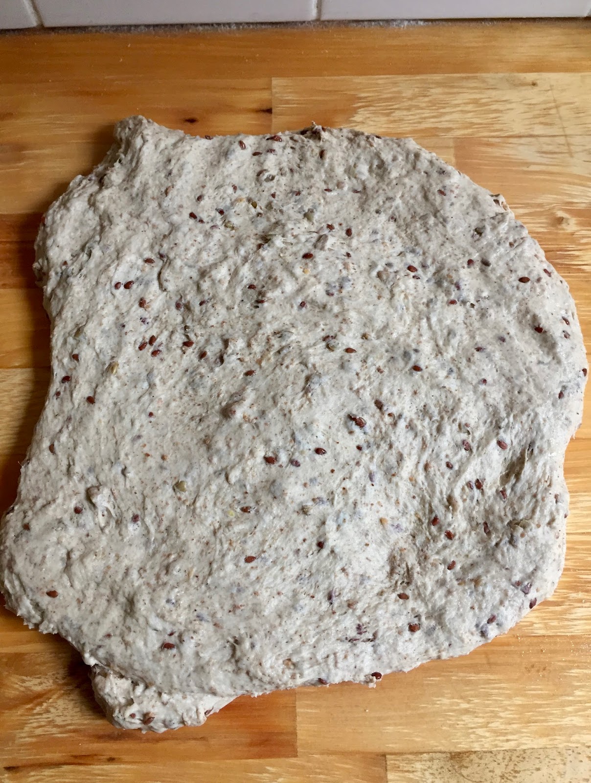 Meine Änderungen: ich habe den Sauerteiganteil ein bisschen erhöht, nicht nur Sonnenblumenkerne, sondern auch die Altbrotkrümel geröstet, und die Methode auf – mein bevorzugtes – Strecken und Falten (à la Peter Reinhart) mit Übernachtgare umgestellt. Daher konnte ich auch die Hefemenge im Hauptteig etwas verringern (mangels Frischhefe verwende ich hier in Maine grundsätzlich Trockenhefe).