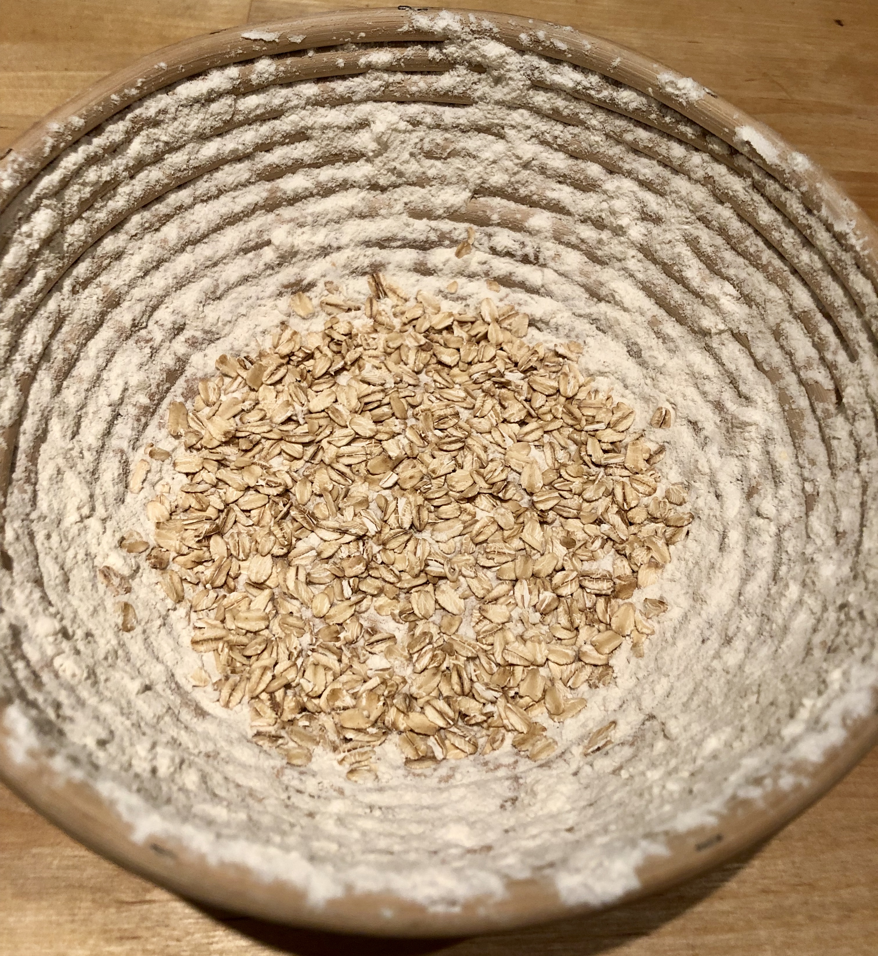 Arbeitsfläche zur Hälfte gut bemehlen, zur Hälfte unbemehlt lassen. Gärkörbchen gut bemehlen, und den Boden mit Haferflocken ausstreuen.