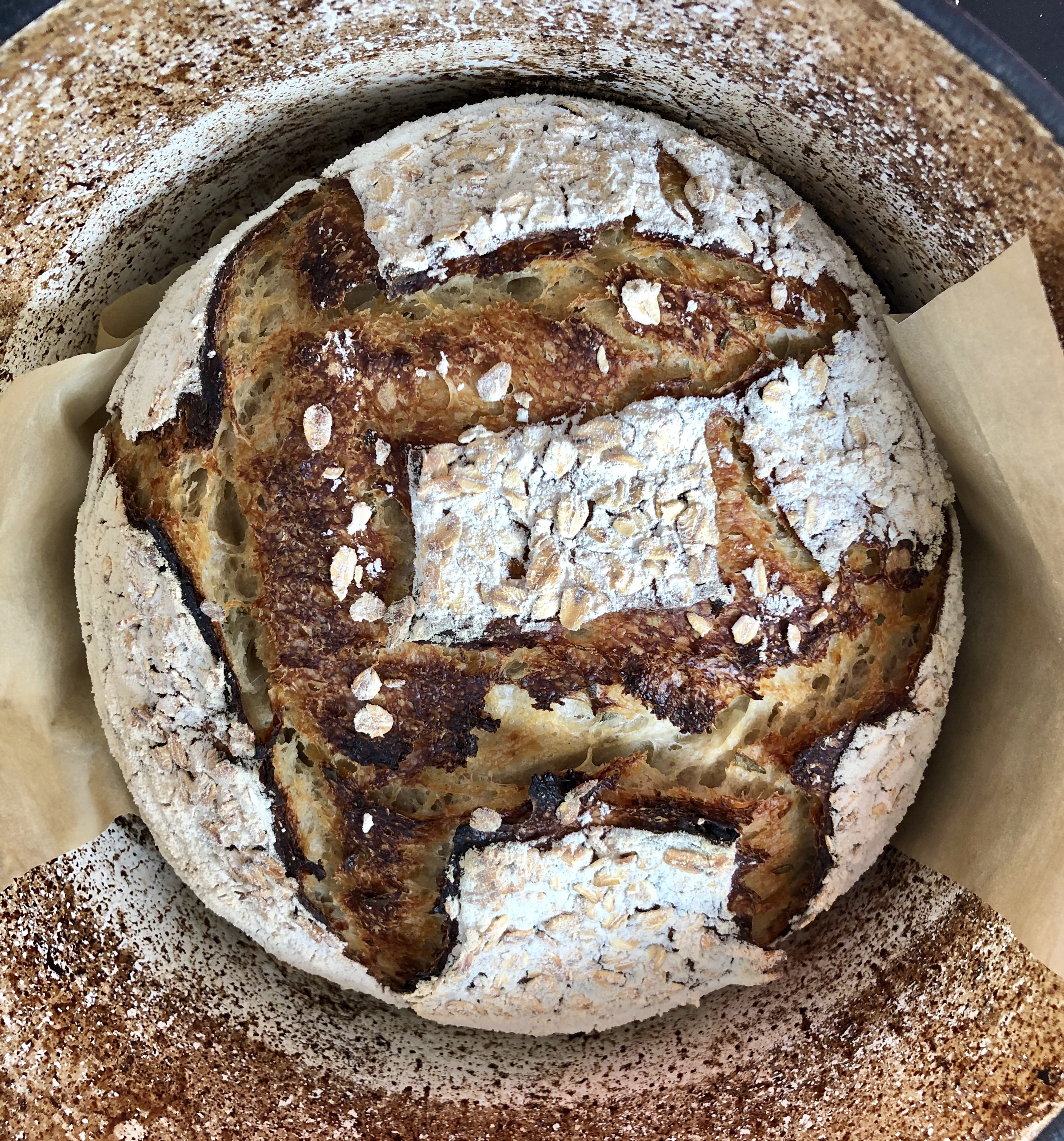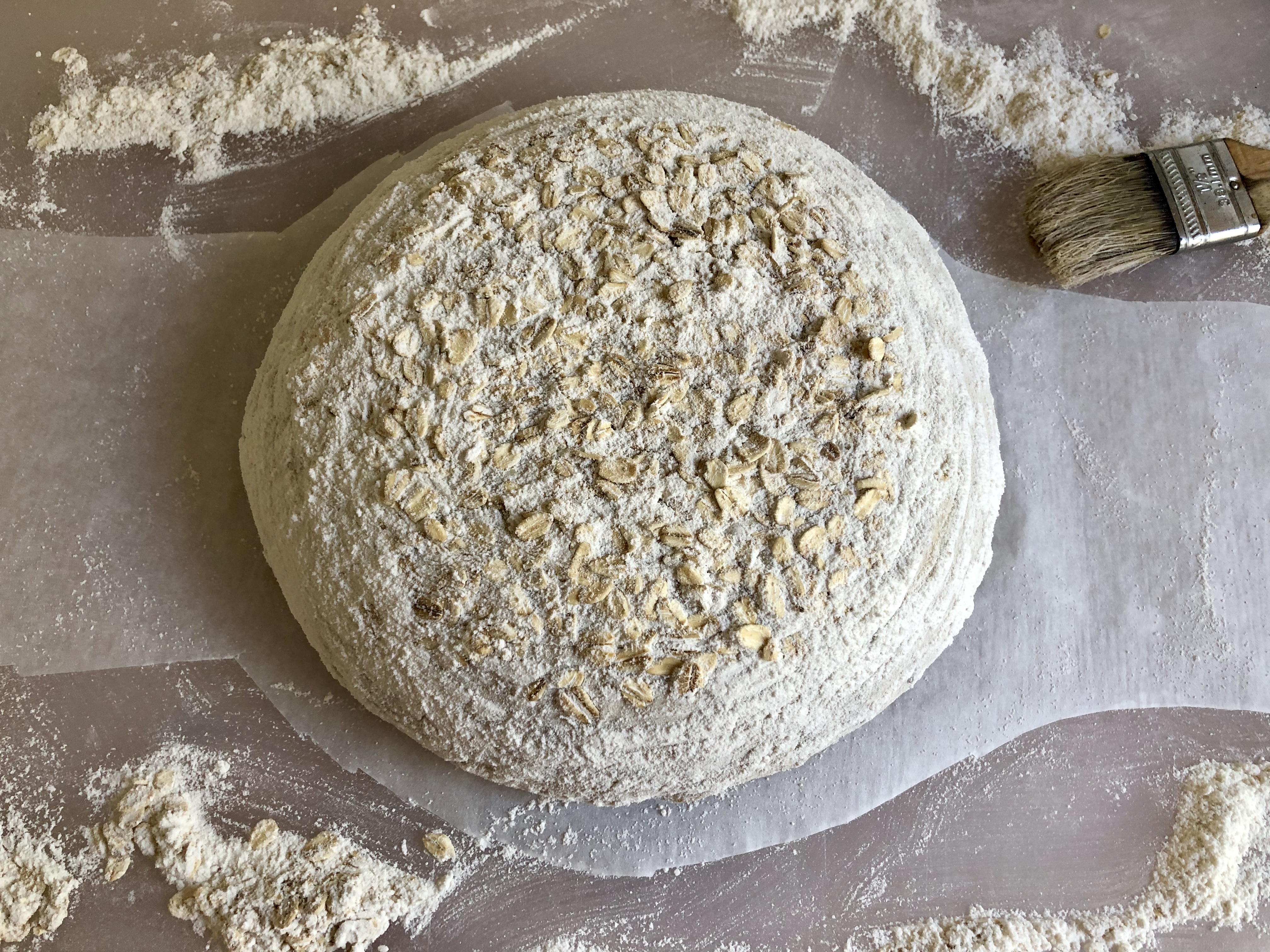 Brot mit einem energischen (!) Klaps des Gärkorbs aufs Backpapier ausstülpen. Papier um den Laib herum zu einer Schlinge zurechtschneiden (damit beim Backen nicht zu viele Falten entstehen). Überschüssiges Mehl mit dem Backpinsel abbürsten.