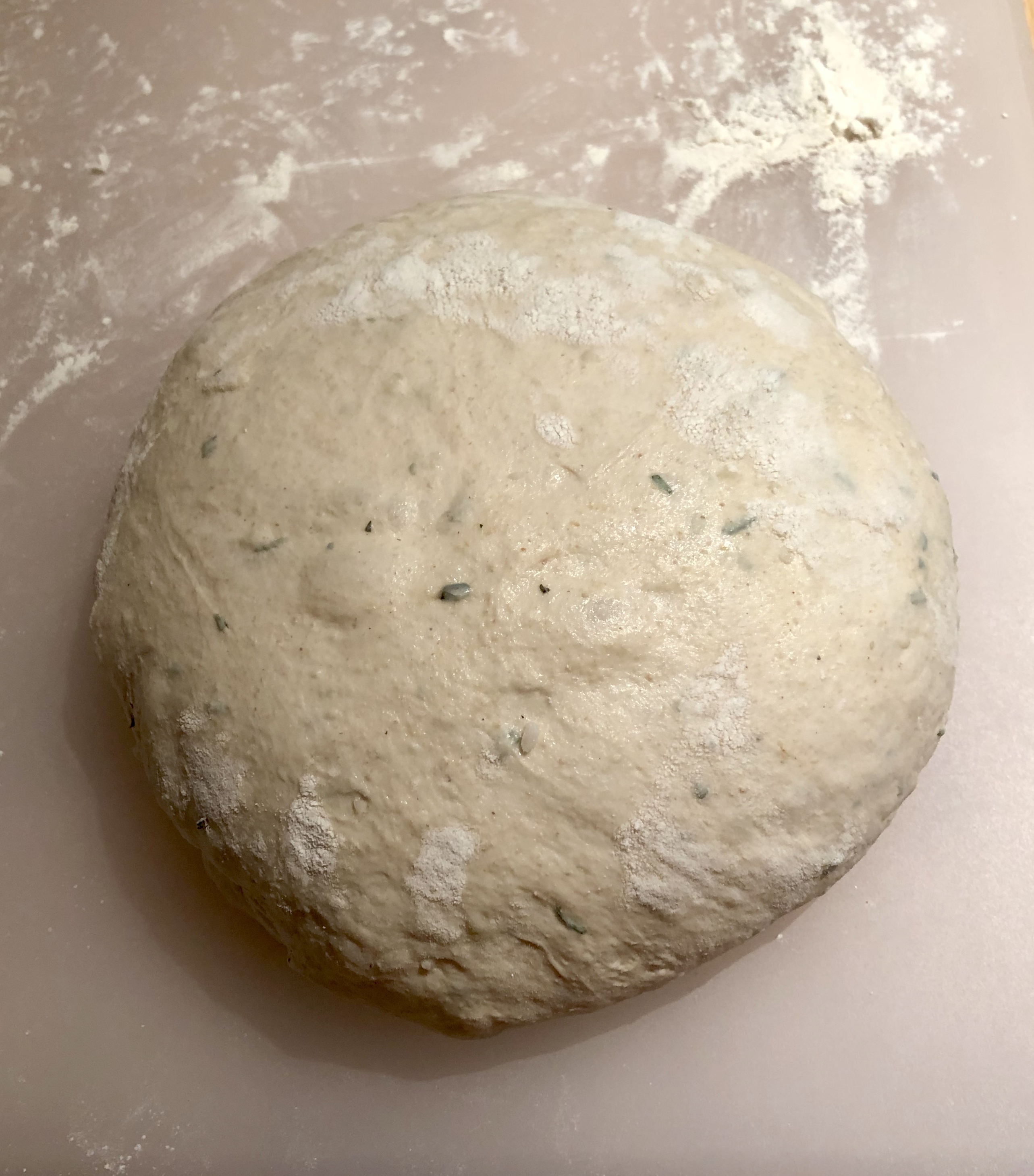 Teig auf die bemehlte Arbeitsfläche geben. Mit bemehlten Händen von allen Seiten zur Mitte hin falten. Teigling so umdrehen, dass er (mit der Naht nach unten) auf der unbemehlten Fläche zu liegen kommt. Zu einem straffen Laib schleifen.