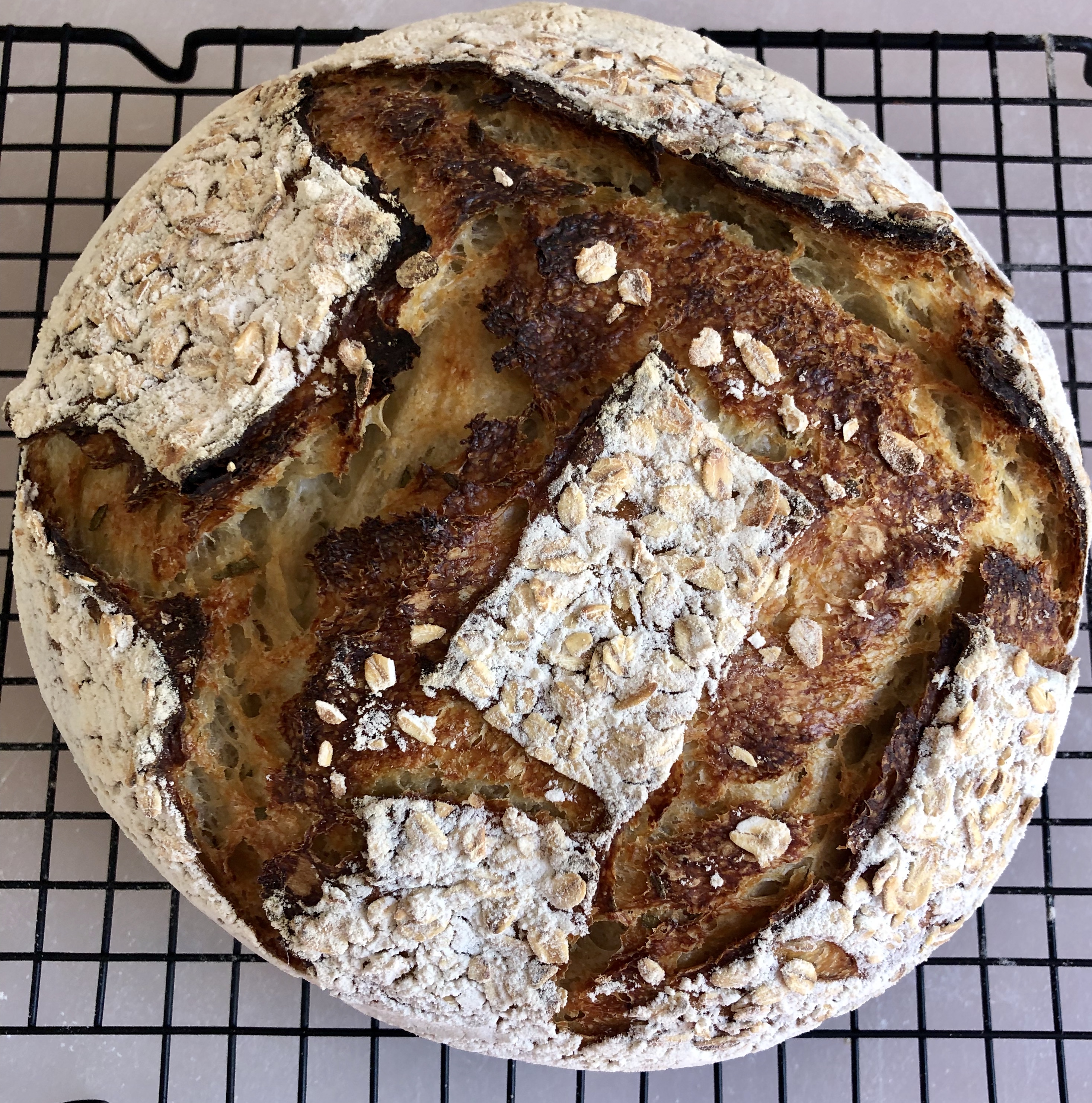 Heraus kam ein würziges, sehr saftiges Brot mit leichtem Rosmarinaroma, das wir mit grosser Begeisterung zum Lunch verzehrten.