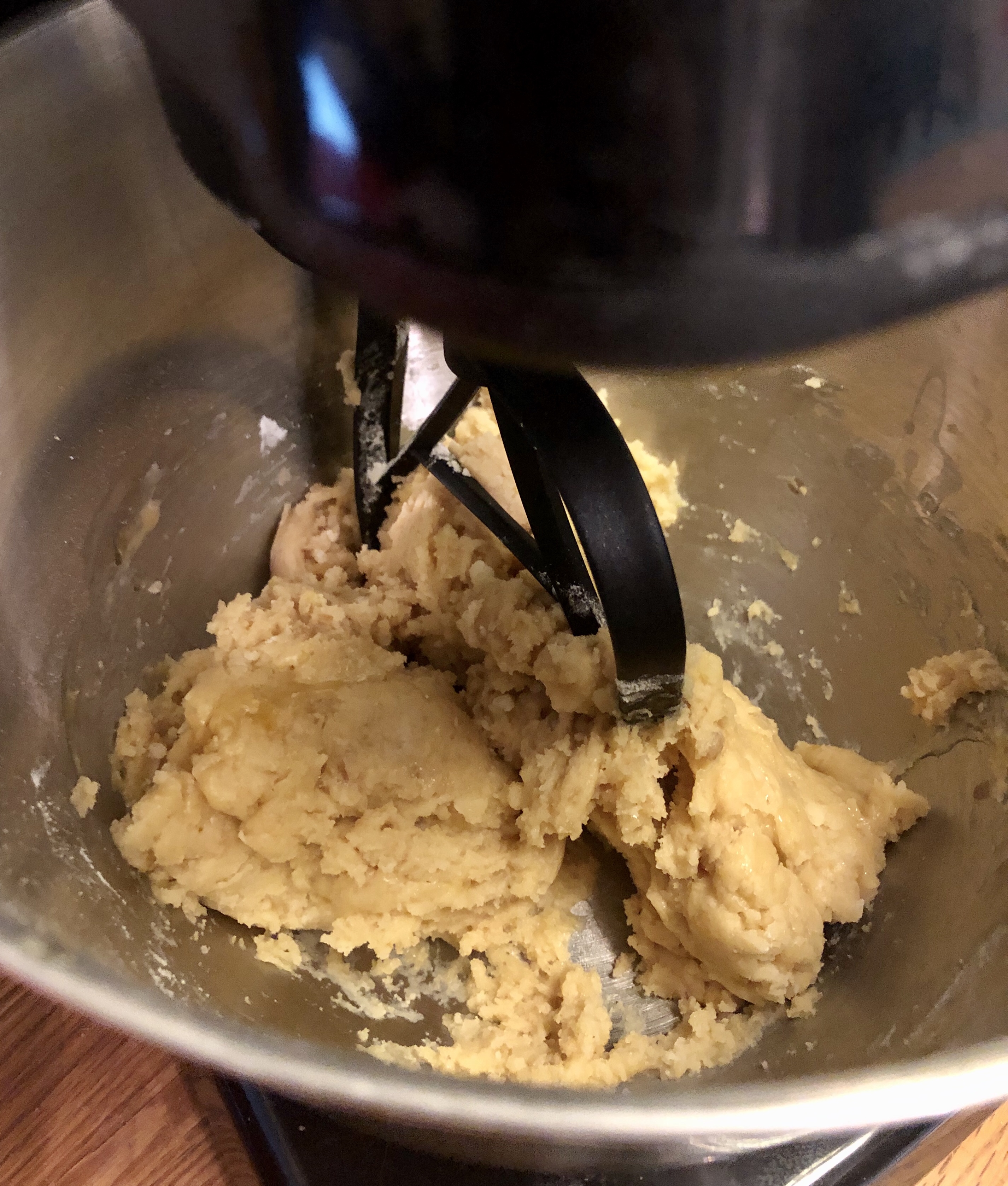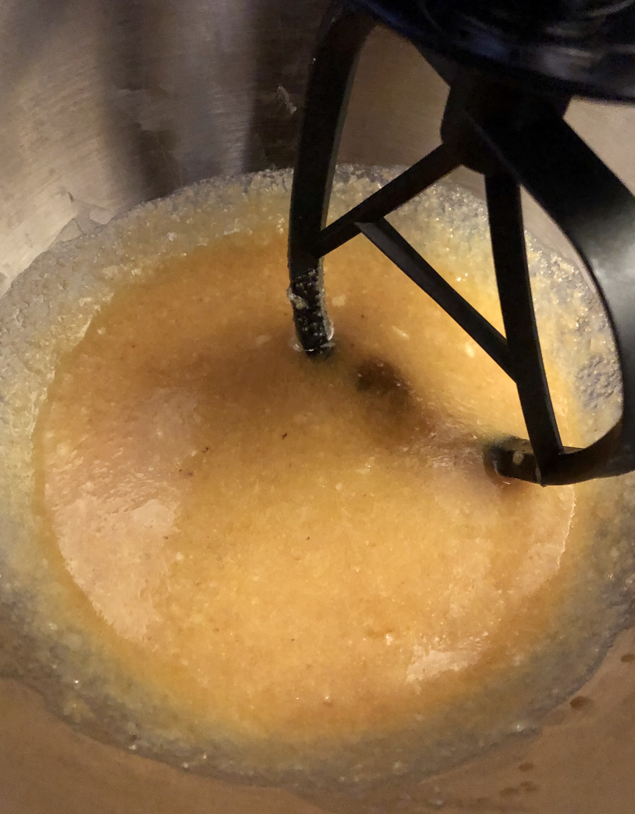 Butter, weissen und braunen Zucker, Ei, Öl, Vanillezucker und Salz im Mixer auf mittlerer Stufe mischen (ca. 1-2 Minuten), dabei zwischendurch an den Schüsselwänden herunterschaben, damit alle Zutaten gut vermengt sind.