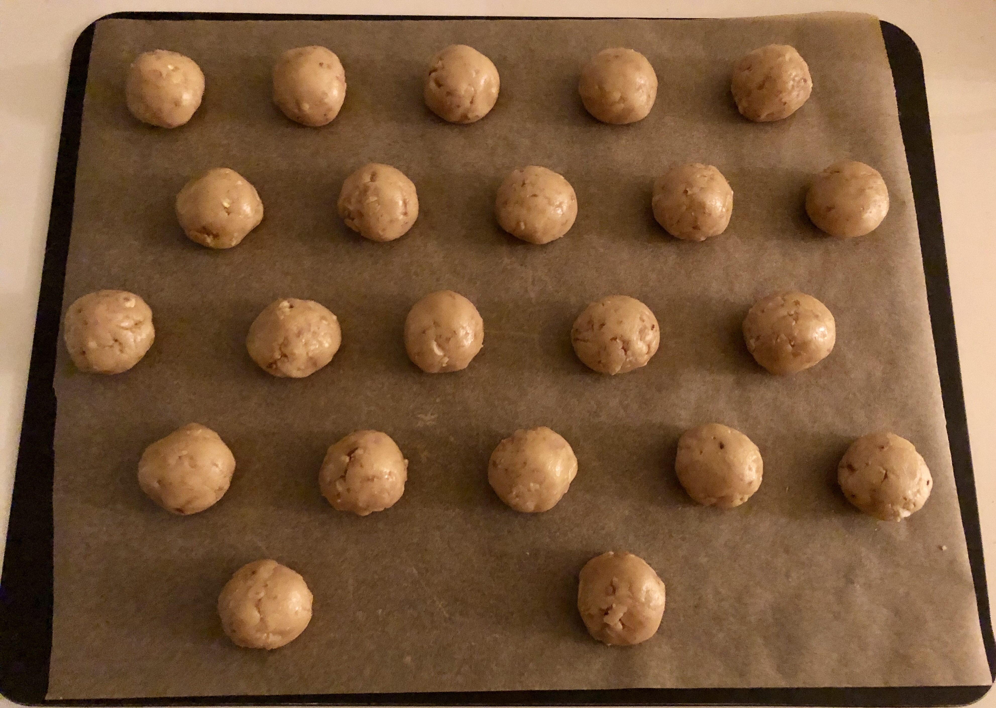 Mit 2 Teelöffeln Teigportionen à ca. 25 g abstechen und mit den Händen zu kleinen Kugeln rollen. Teigkugeln mit mindestens 3 Zentimeter Abstand aufs vorbereitete Backblech setzen.