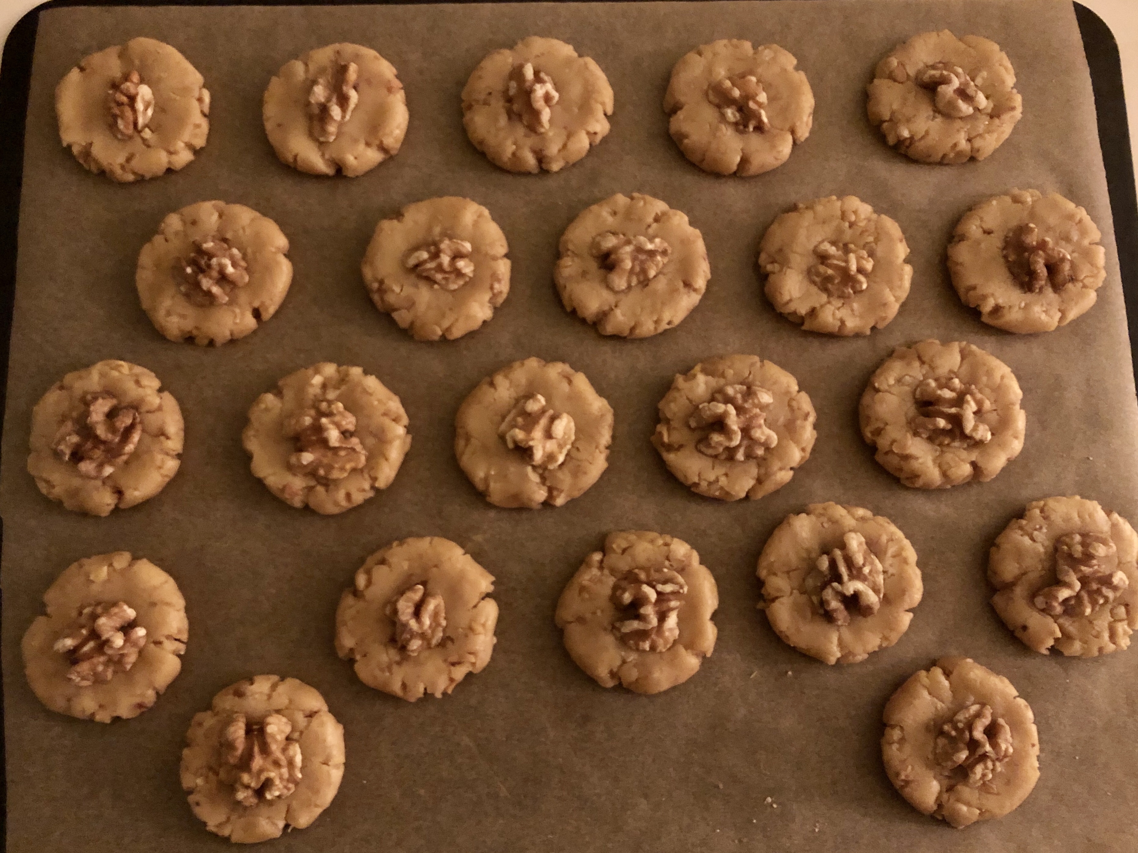 Teigkugeln flachdrücken und je eine Walnusshälfte in die Mitte setzen