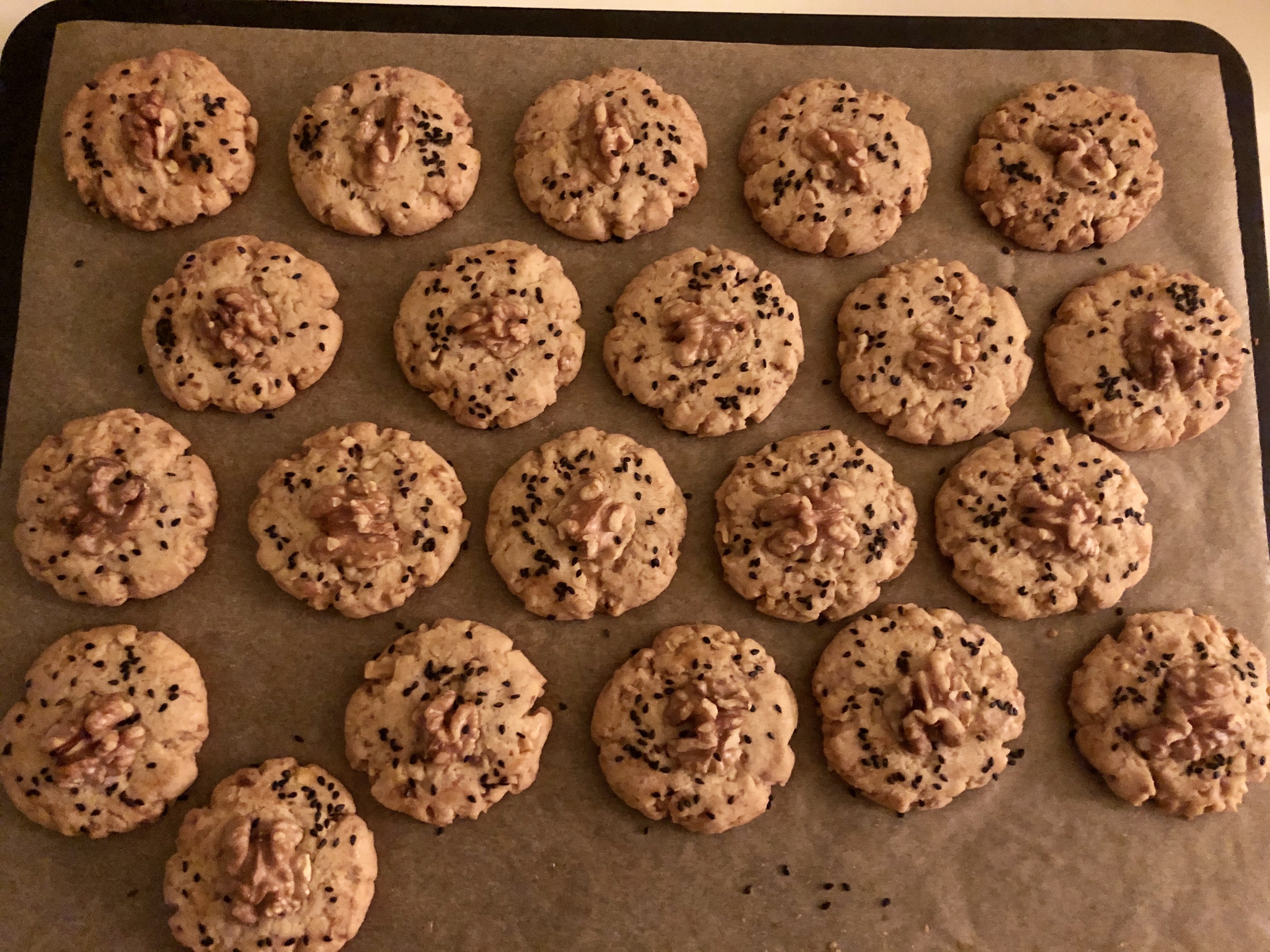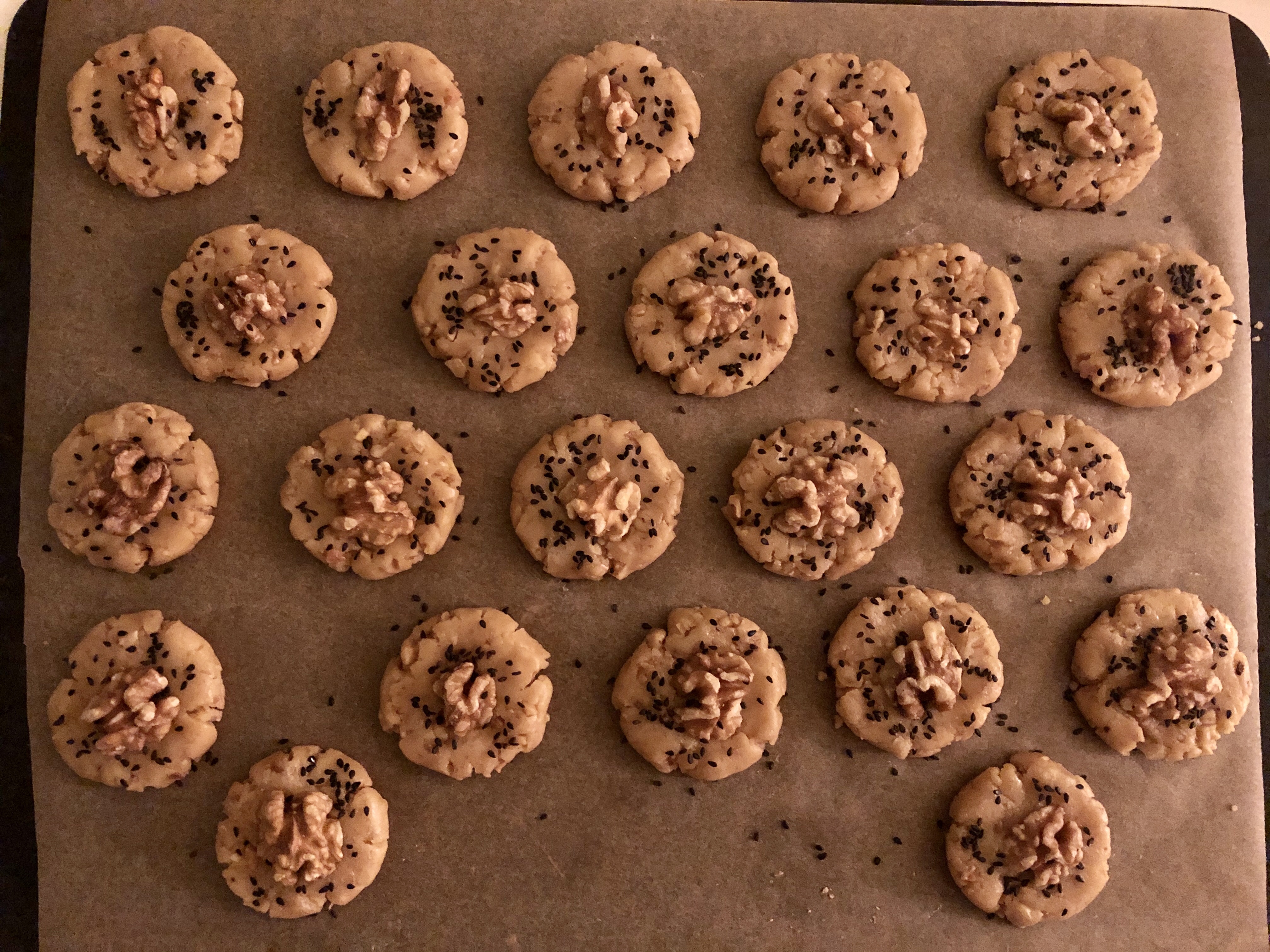 In die Mitte jedes Kekses eine Walnusshälfte drücken, dann Oberfläche mit Eiweiss bestreichen und mit schwarzem Sesam bestreuen.
