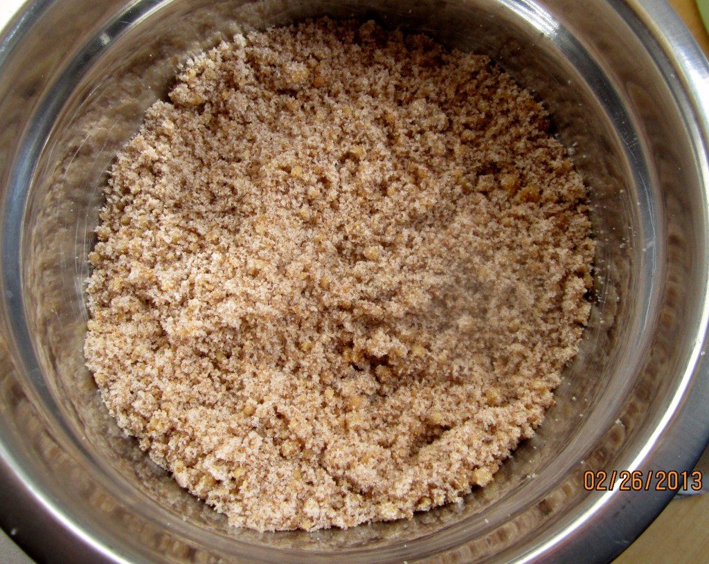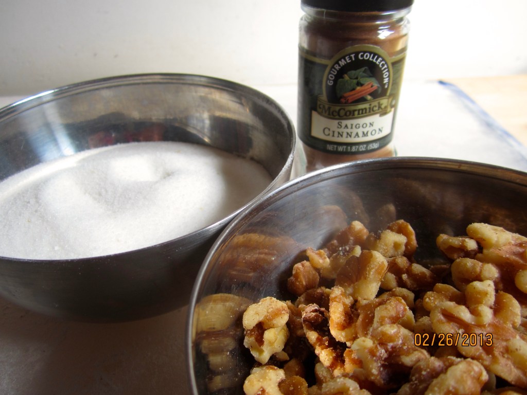 Walnüsse mit etwas von dem Zucker im Food Processor sehr fein mahlen (Zucker saugt das beim feinen Mahlen austretende Nussöl auf). Nussmasse in eine kleine Schüssel geben und mit dem restlichen Zucker und Zimt gut vermischen.