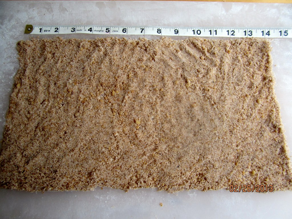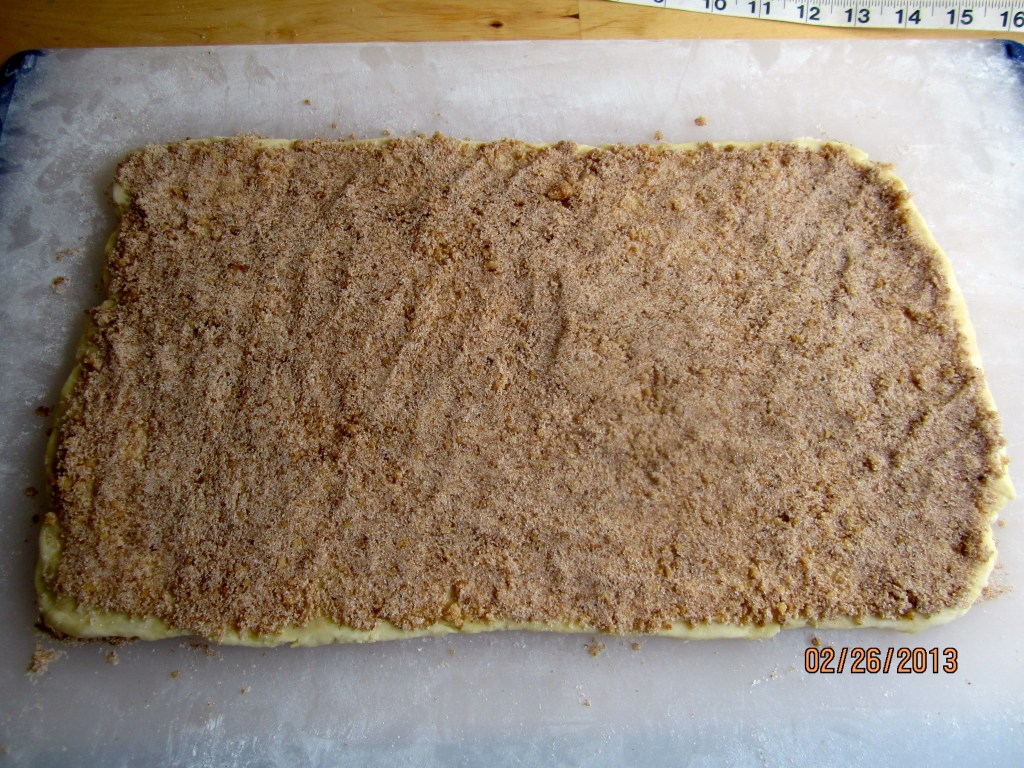 Auf einer sauberen Arbeitsfläche Hälfte der Nussfüllung zu einem ebenfalls ca. 20 x 35-cm großen Rechteck ausstreuen. Ausgerollte Teigplatte bündig darauflegen.