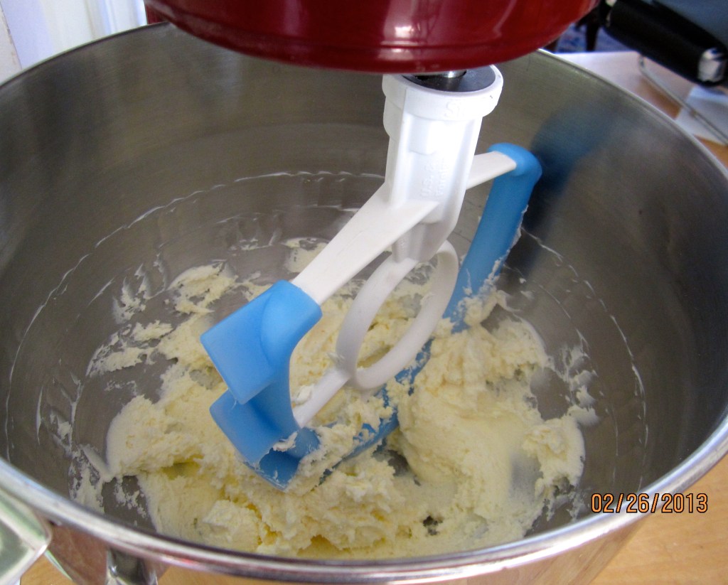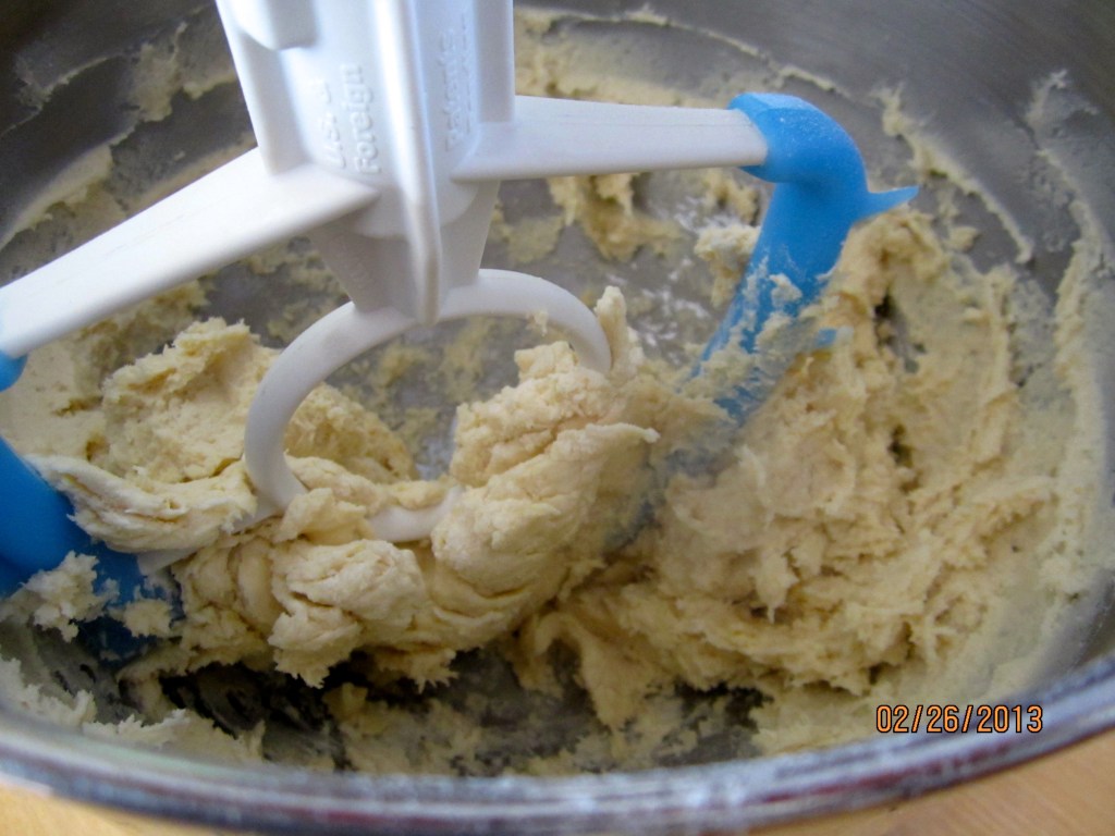 Auf niedrige Stufe herunterschalten und Mehlmischung in 2 Portionen unterrühren, bis ein weicher Teig entsteht.