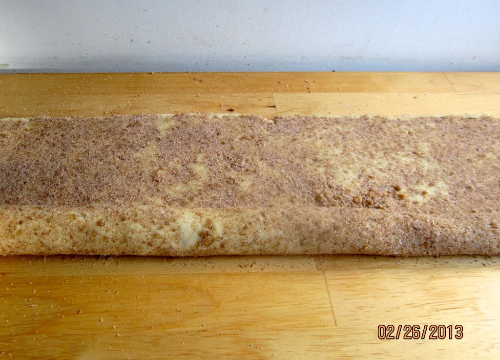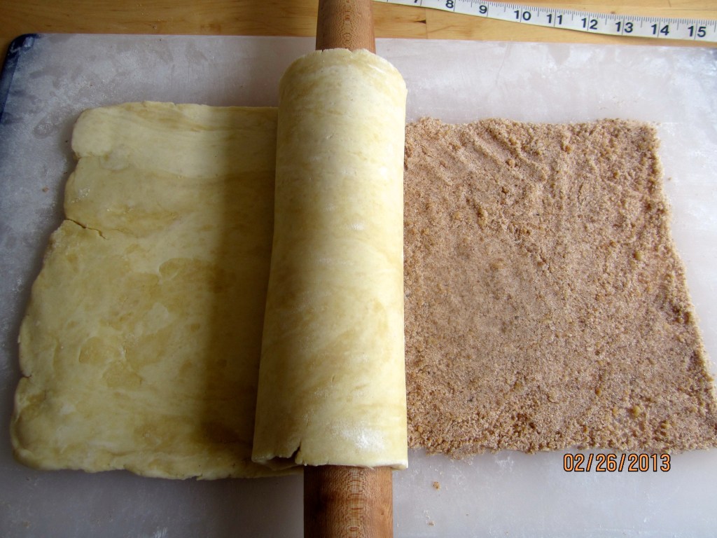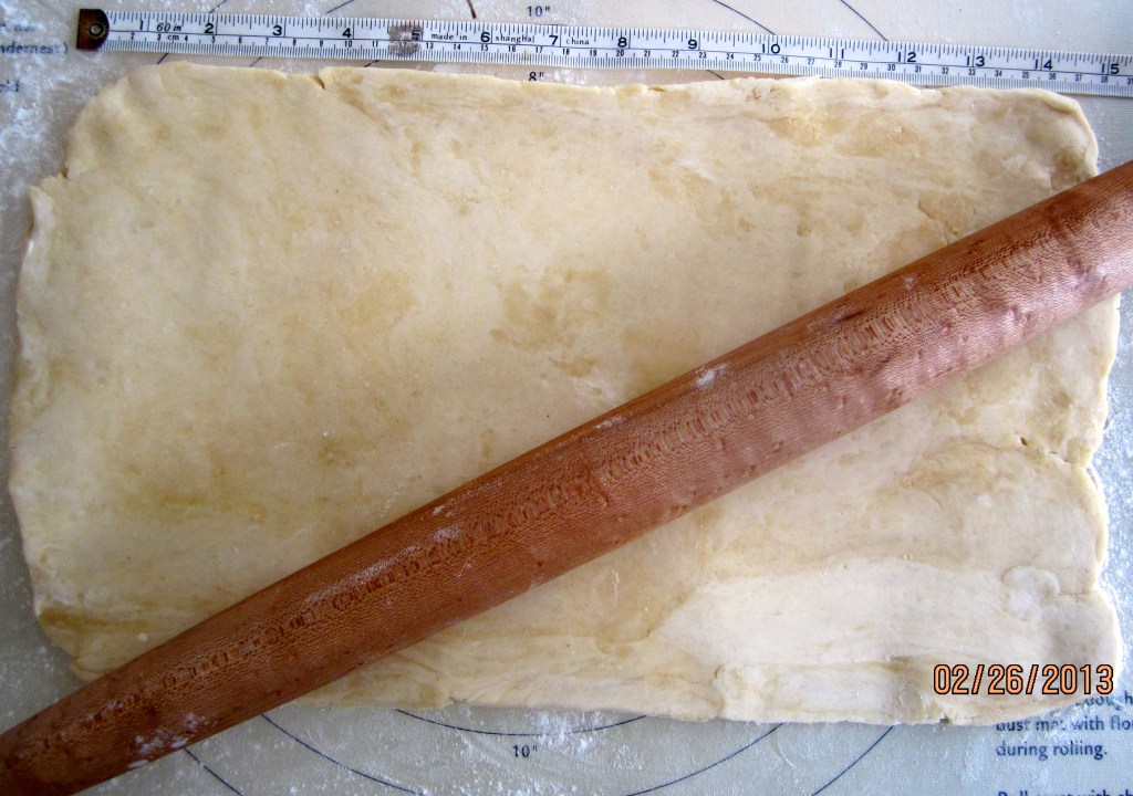 Teigplatte nun zu einem 28 x 66-cm breiten Rechteck (3-mm dick) ausrollen. (Herausfallende Füllung zurück auf den Teig streuen.)