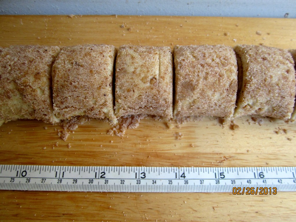 Mit einem scharfen Messer in 16 gleichmäßige, ca. 4-cm breite Scheiben schneiden.